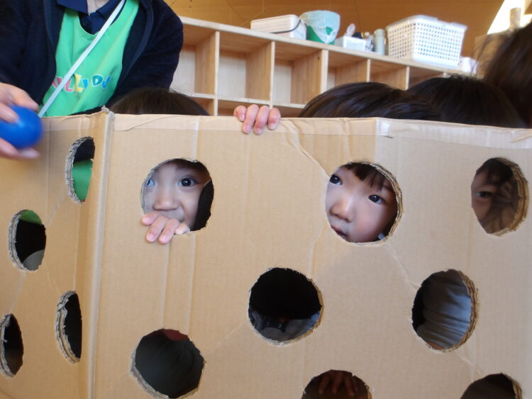 穴の中にボールを出し入れして遊ぶお友だち。穴からお顔を覗いて、こちらの様子を見ていました👀✨