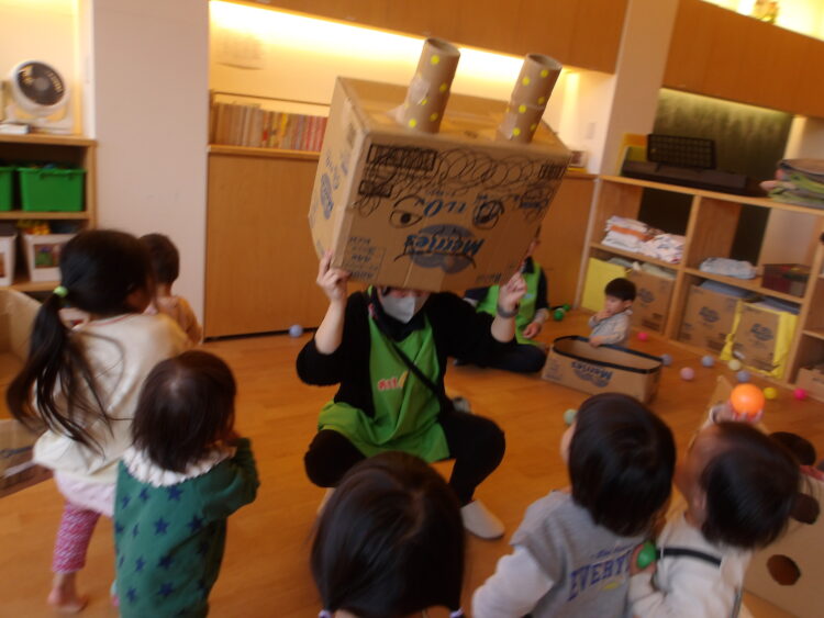 たくさんの豆を入れた段ボール箱を持って、果敢に鬼に立ち向かっていたあひる組さん✨