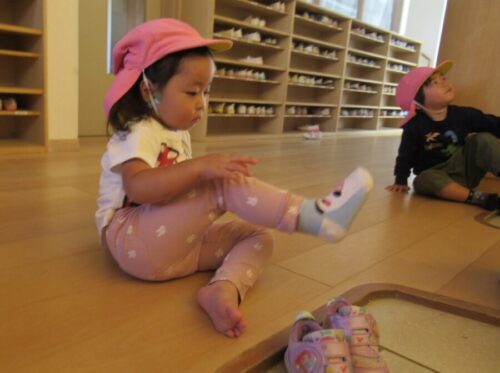 お友だちと「こっちかな?」「はんたい!」と靴の左右を気にしているお友だちがいましたよ😄