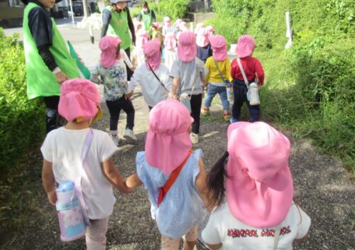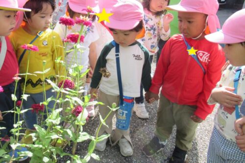 仲良しのお友だちと手を繋いで気になる植物をじっと見つめるあひる組さん😄