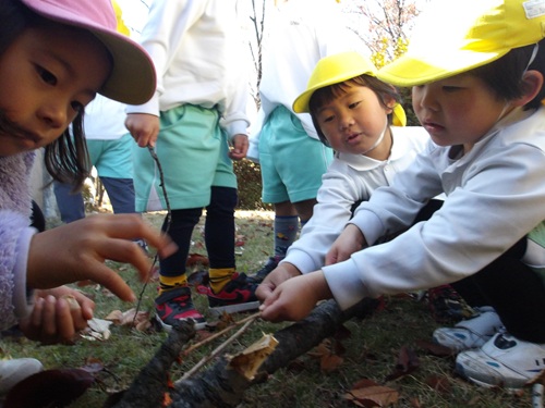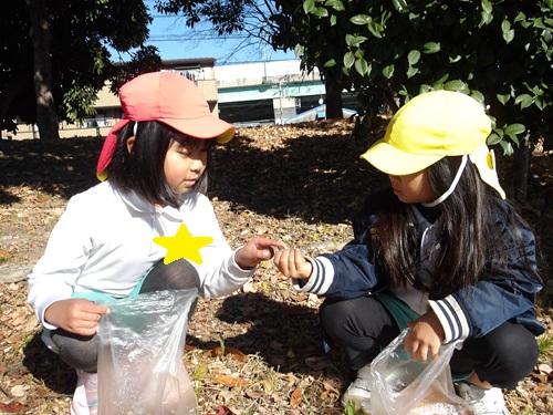 どんぐりや松ぼっくり、椿など「向こうにたくさんあったよ!」と子ども同士で情報を共有して遊んでいる様子がありました!
