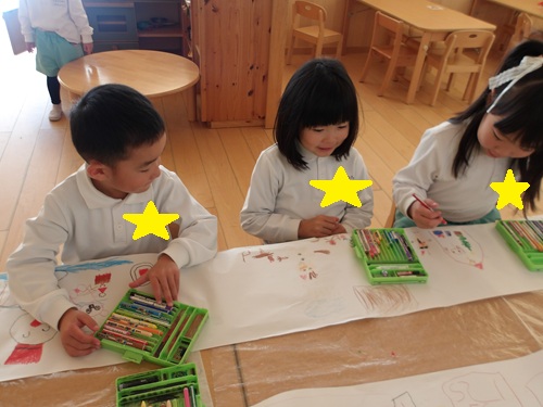 お部屋遊びのお友だちは、長いロール紙に「クリスマスかこー!!✨」と皆で決めて雪だるまやサンタさんツリーやお家などイメージが膨らんでいるようでした🎄✨