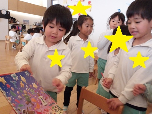 「ジンジャーブレットってどんな形だったけ?」の声に、「この本にあったよー」と持って来て形を見ている姿がありました✨