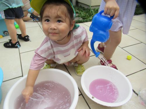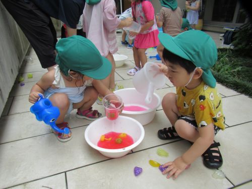 今日の色水遊びでは桶に赤色、黄色、青色の三色を用意すると、自分のコップを使って色を混ぜてみたりして色の変化を楽しみました🤭💙💛❤