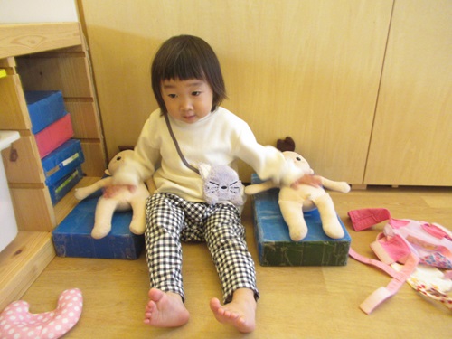 おままごとコーナーでは、両手に赤ちゃんをトントンして寝かしつけをしていましたよ😊