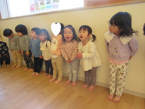 「朝の歌を歌います🎵」とピアノの伴奏が流れてくると、壁際に並んで元気に歌っていましたよ😄