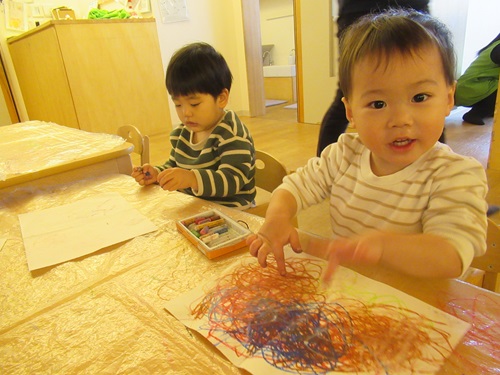 お絵描き遊びをしました!ひよこさんも、お兄さんお姉さんと同じクレヨンを使って描くことができました✨