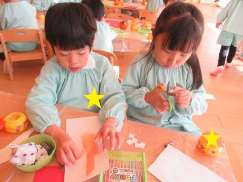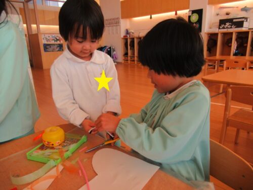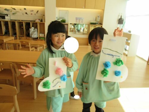 毛糸や花紙、モールなど、色んな材料から自分の好きな物を選んで、貼っていきます。うさぎ組さんは材料を切る時、きりんさんに手伝ってもらいました😊
