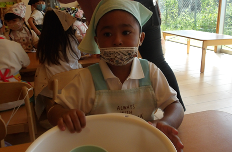 「先生、エプロンと三角巾、マスク持って来たよ」と朝から楽しみにしていました😆