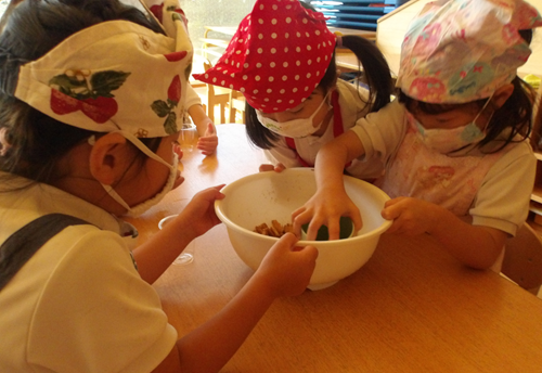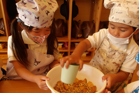 お友だちが砕いている時に、ボウルからこぼれないようにそっと添えていました優しさを感じましたよ