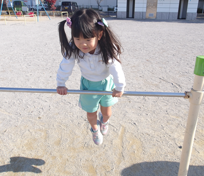 遊具で遊んだお友だちは、「先生みて!」と一人で鉄棒ができるようになったことが嬉しくてたくさん練習していました![]()