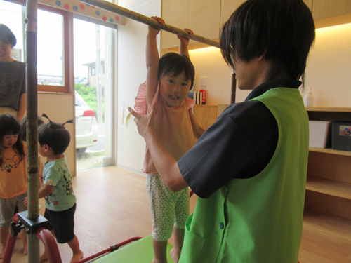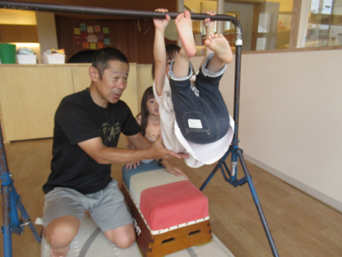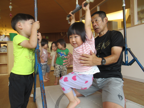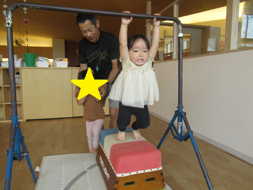 ぶら下がるだけで物足りないお友だちは、足を揺らしたり、足を上げて