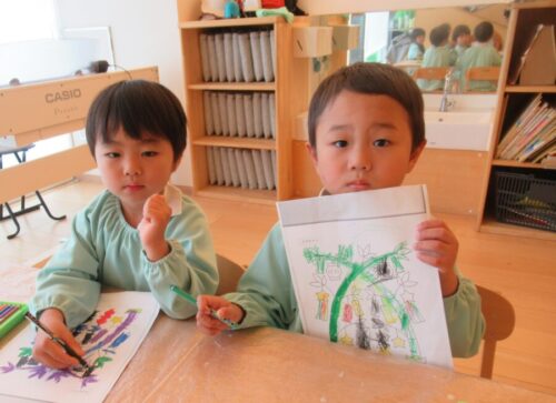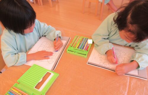 昨日に続いて、今日も雨☔ 楽しみにしていたプールが中止になって残念そうな子どもたちでしたが、雨の日の遊びで、ぬりえを準備すると、張り切って塗っていました😍