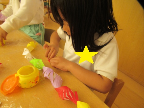 きりん組さんも小さい紙を使って一人ひとり「貝飾り」を作っていましたが、、、、