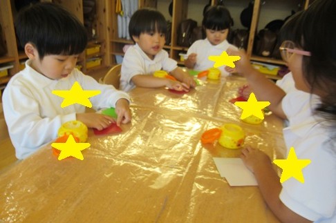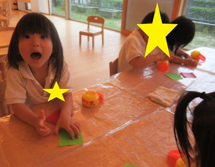 のりの量に気を付けながら「この角にのりを」つけるよね?」とお友だちと話しながらで楽しそうでした![]()