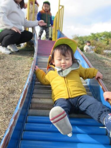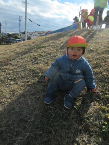 ひよこぐみのお友だちは山から駆け下りたりまだ怖いお友だちはおしりをついて降りたり自分の力で昇り降りをして遊んでいましたよ![]()