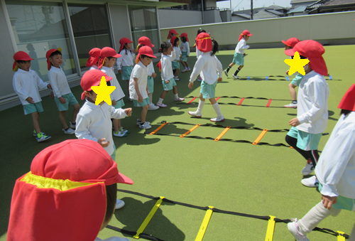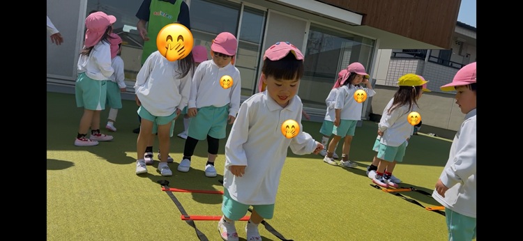 ラダーを使ってケンケンをしました。少し難しかったようですが先生にポイントを教えてもらいながら楽しんでいましたよ🎵