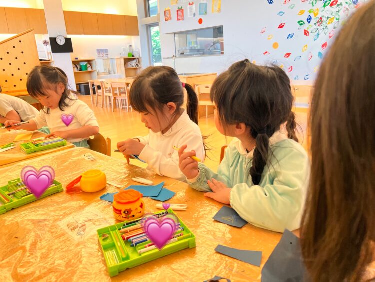 お部屋で遊びたいぱんだ組さんは自由製作で自分の名札やオリジナルヘアピンを