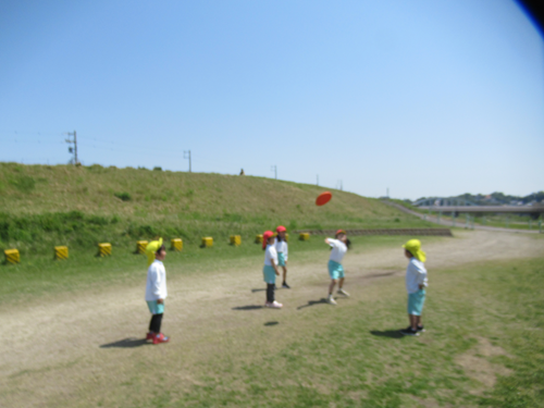 フリスビーを上手く投げられるようになったきりん組さんがぱんだ組のお友だちに見本を見せて教えてくれていました😊