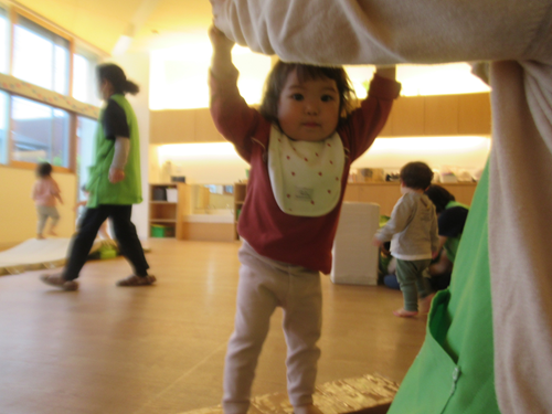おへやのいろいろなところでつかまり立ちをして運動したり、先生と一緒の