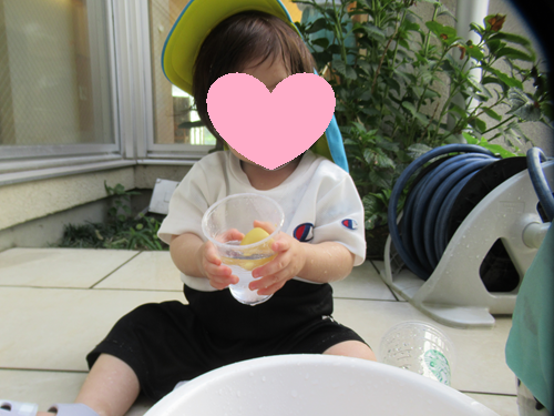 たらいにおもちゃを浮かばせて、カップに移し替え楽しんでいました✨