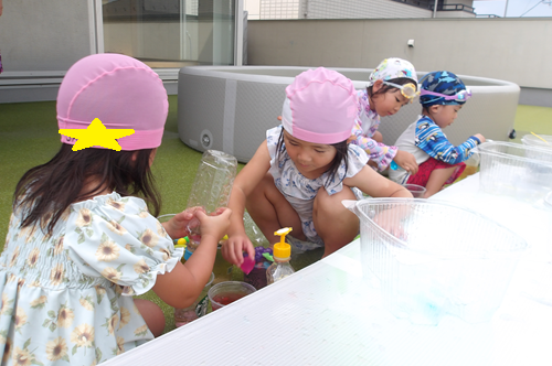 プール遊びでは、ジューススタンドを作ってみんなでジュースやさんごっこをしていました🍹