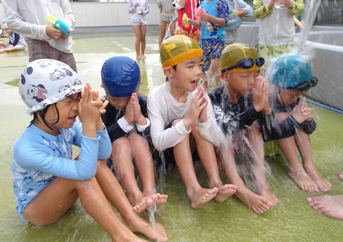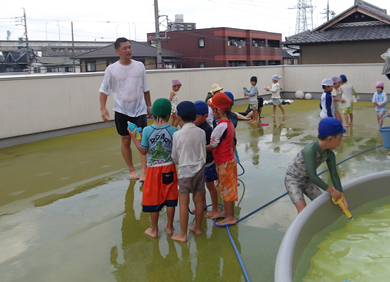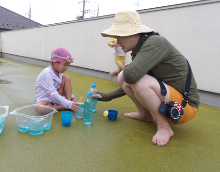 今日もお父さん、お母さん先生と水鉄砲やバケツでダイナミックに掛け合いっこ スタート![]()