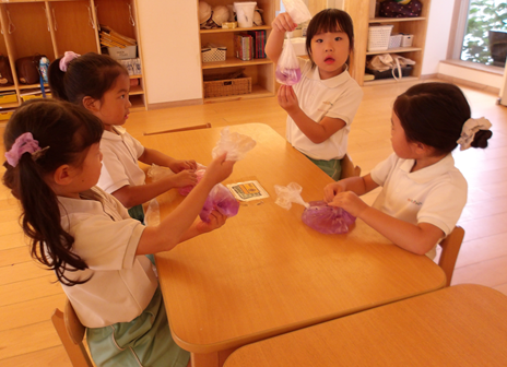 「私は濃い紫になったよ!!」「次は石鹸入れたら何色になるのかな~?」