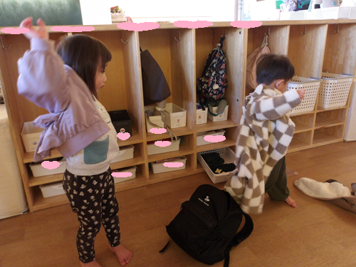 もう片方の腕を通すのに、袖が捕まえられなくて、ぐるぐる回っている子もいました😂