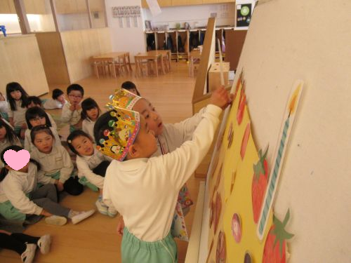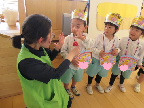先生からの出し物のプレゼント3月は「ふしぎなぽけっと」からいろいろな美味しい食べ物やフルーツが出てきてみんな大喜びでしたよ😆💖
