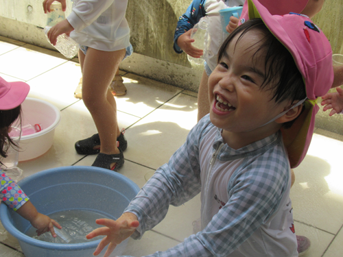 「かけてよ~!」と逃げながらも水にかかるとこの笑顔です😆💖