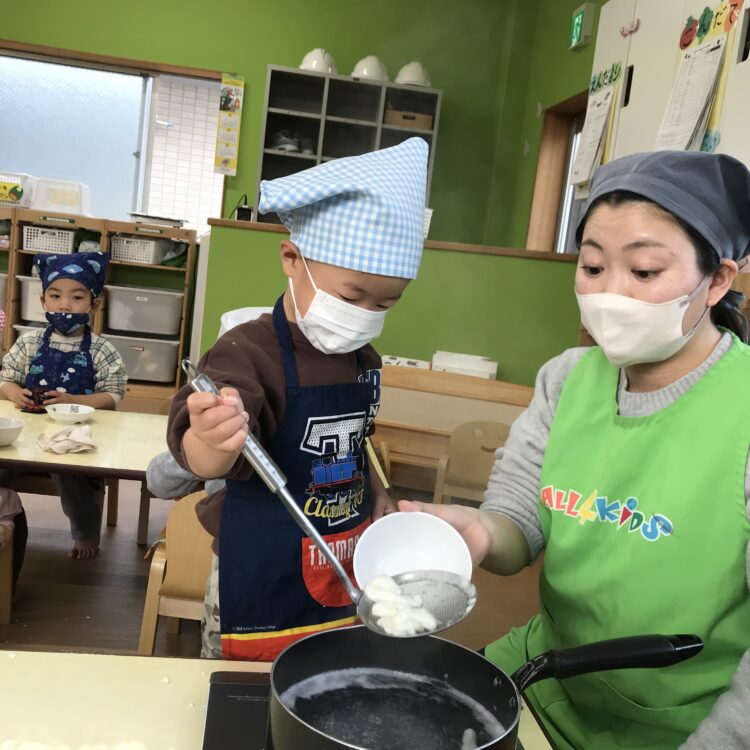 自分達でこねた白玉をお湯の中からすくいあげました。