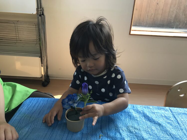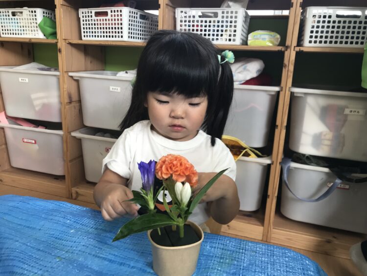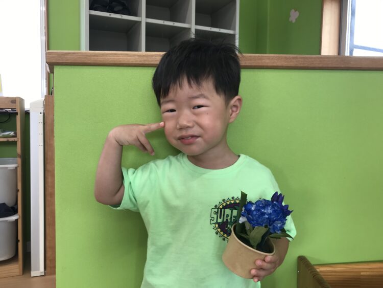 「このお花、なんだろう?」とお話ししながら楽しく取り組んでいます✨ 作ったお花と記念写真📸  とっても上手にできたね😊