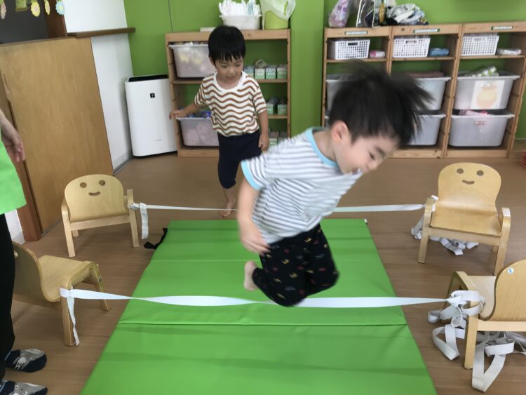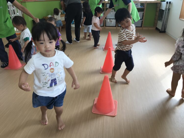 まずはカラーコーンの間を蛇のようにジグザグ歩きました🐍 次は跳び箱の上にジャンプして上に乗ります‼︎ そしてゴム紐の上もジャンプ!  そして最後は楕円のバランスボールの上に乗りました!