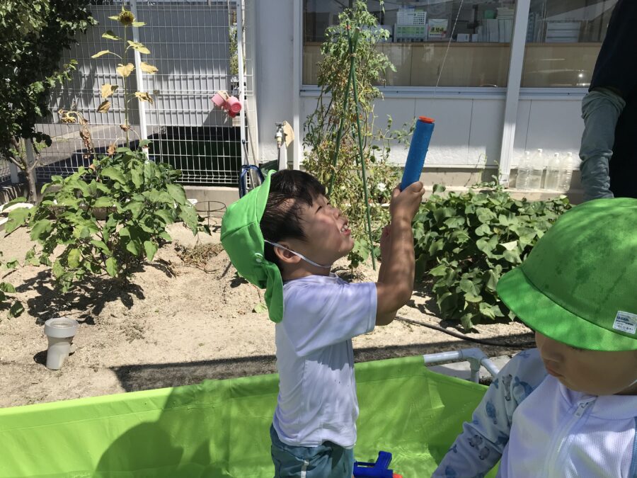 水鉄砲を日除けにかけ、「雨だー!」と遊んでいます☔️