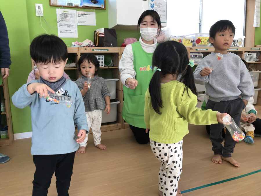 正月遊びの羽根つきもマラカスを使い表現しました😋