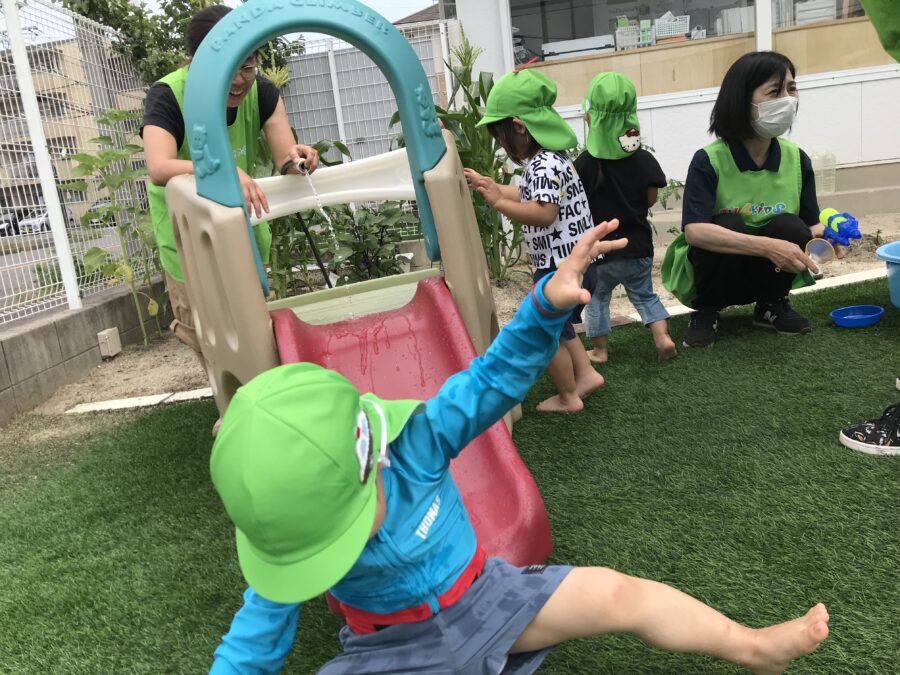 滑り台に水を流して