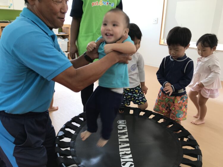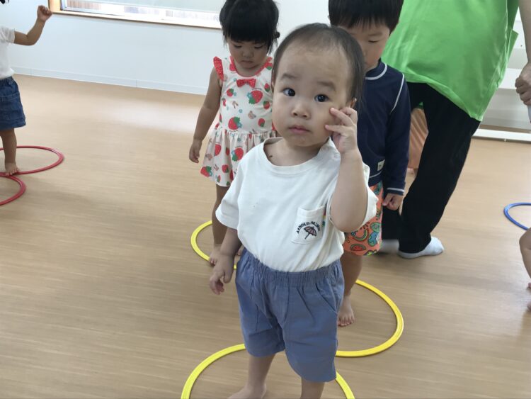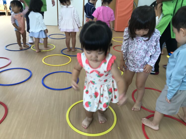 準備体操をして、最初は輪っかの上をジャンプ!!