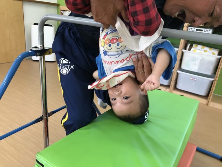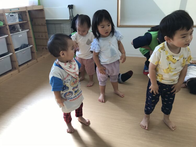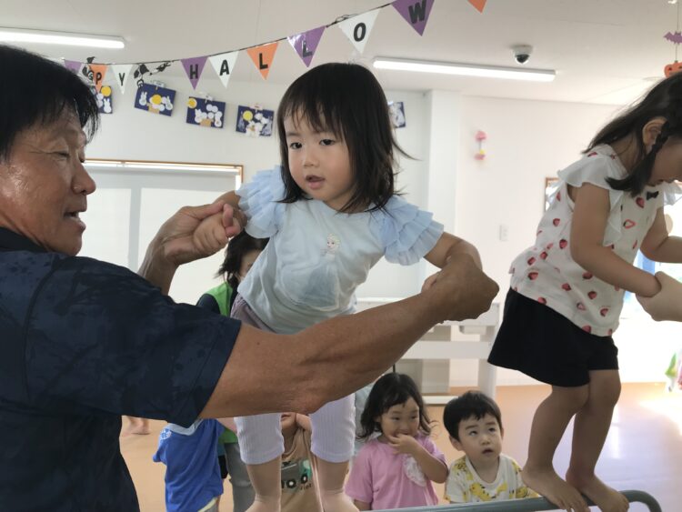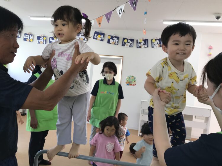 怖がることなく楽しんで取り組んでいます🎶   最後は鉄棒の上に乗ってみました!  怖がりながらも楽しそうにする子どもたちでした😊