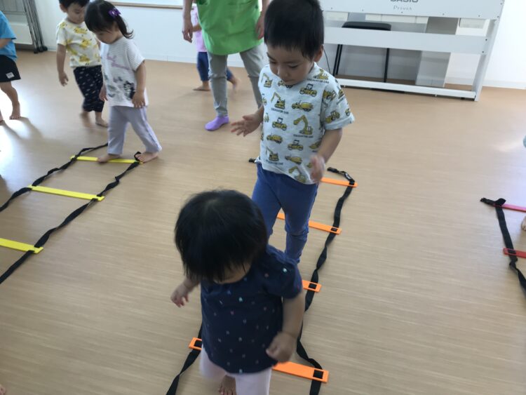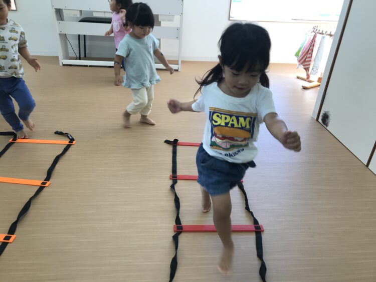 準備体操から元気いっぱいの子どもたち😊 まずはハシゴの上を歩いたり、ジャンプをしました🪜  次は鉄棒の上でぶら下がり😊
