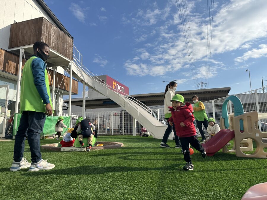 2歳児さんみんなで かけっこをしたり、かくれんぼを楽しんでいます。