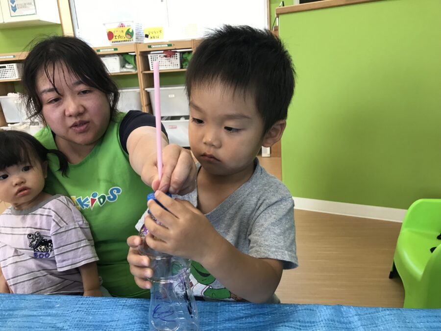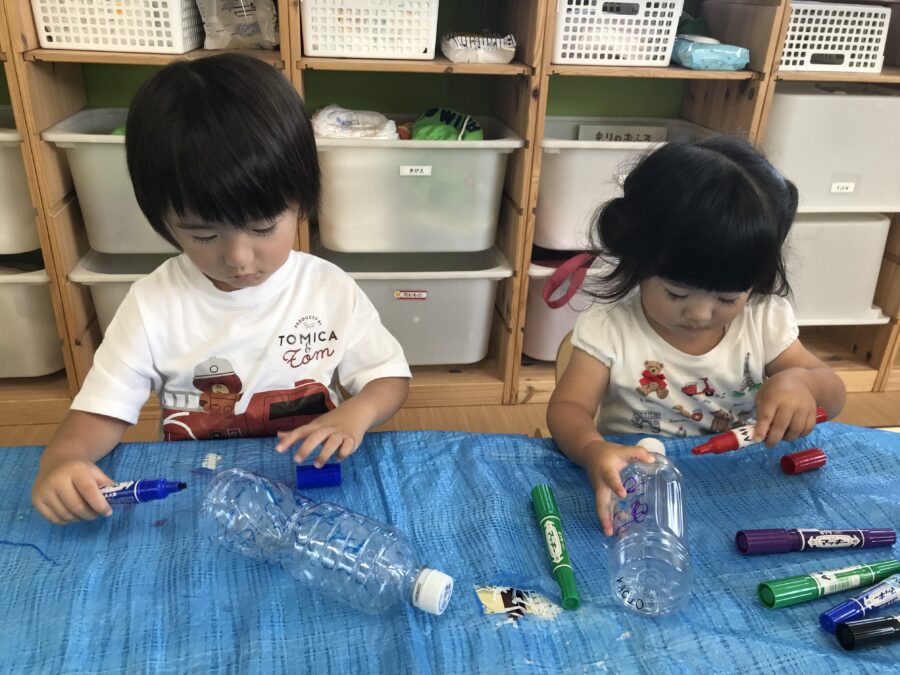 プール遊びで使う水鉄砲作りを行いました😊