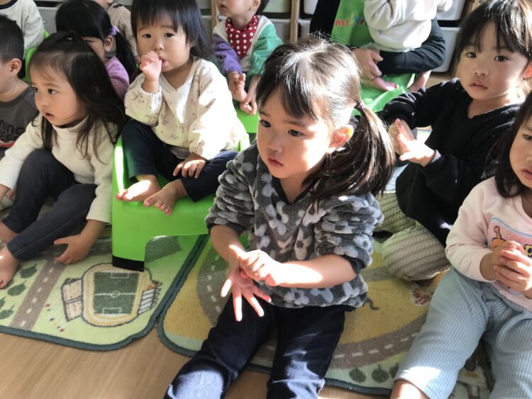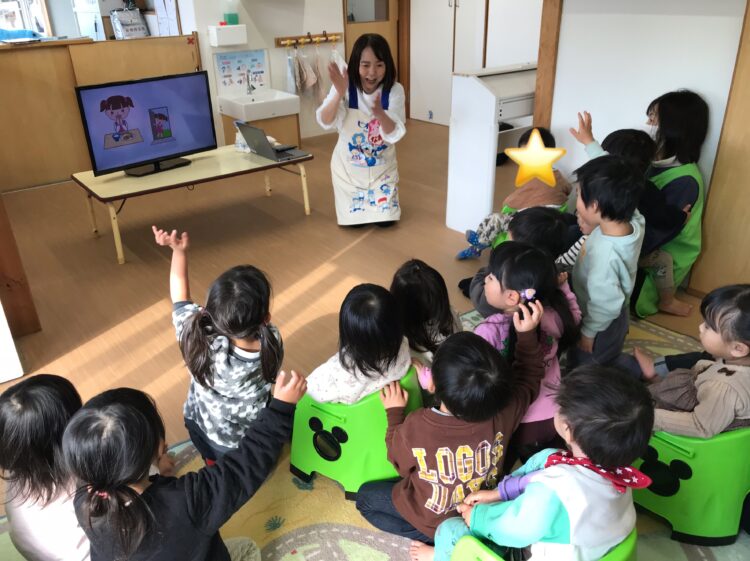 「ご飯の前やお家に帰った後、手を洗っているかな?」と質問されると元気よく返事をしていました😊