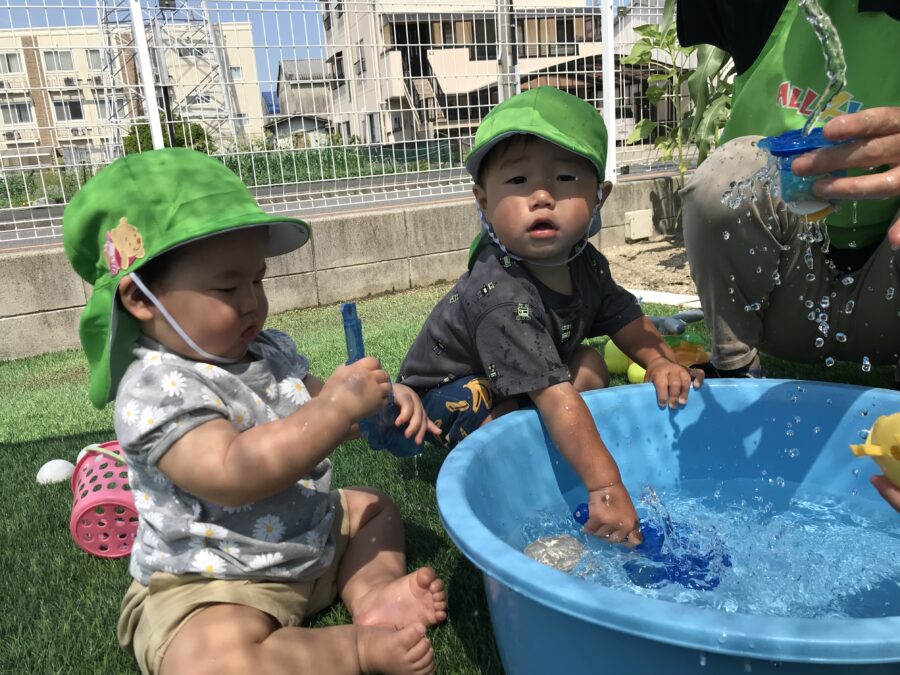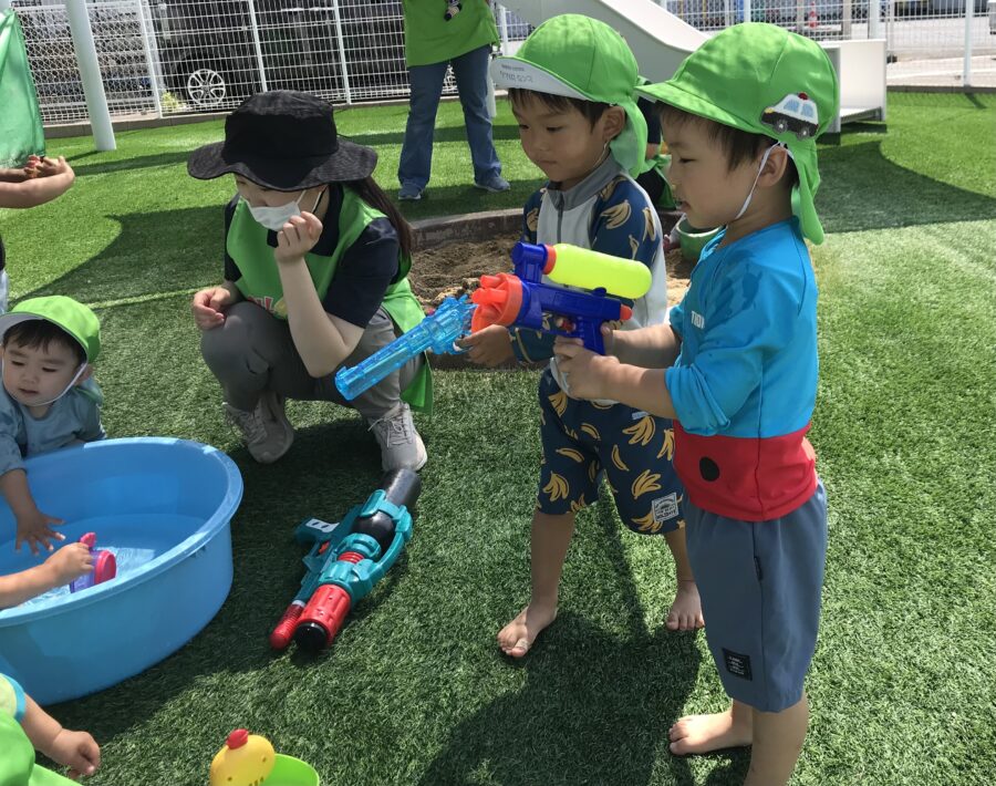 保育士やお友達に水をかけて