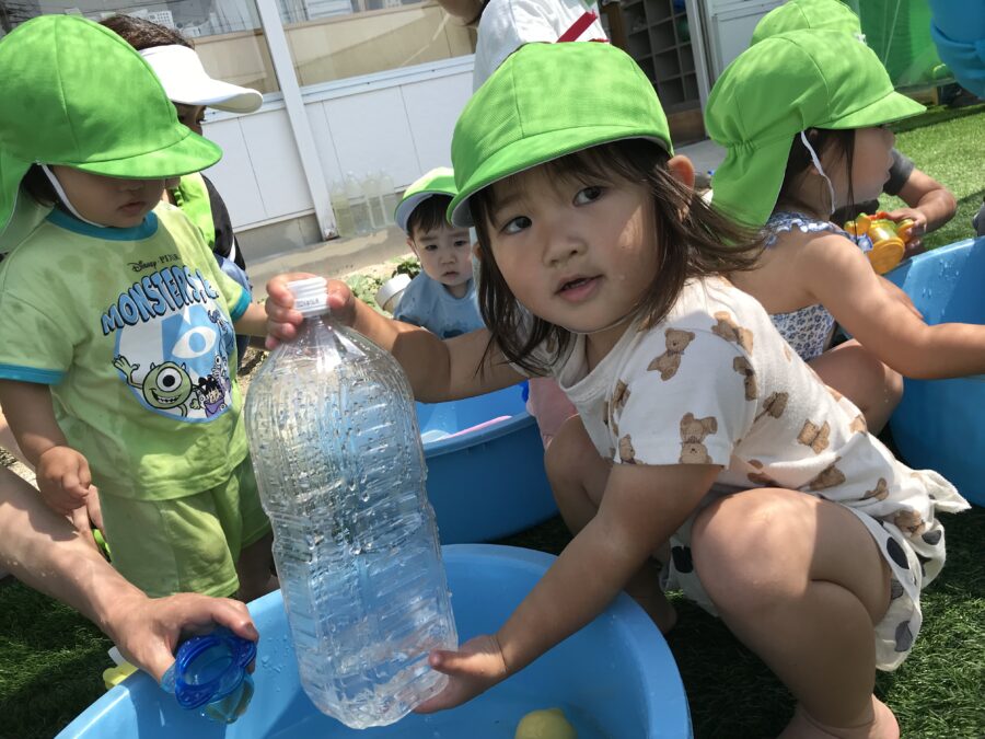 園庭に出ると「水遊びだ〜」と