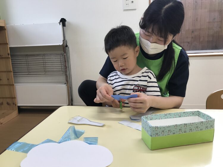 2歳児さんは 雨雲、1歳児さんは てるてる坊主で製作をしました。
