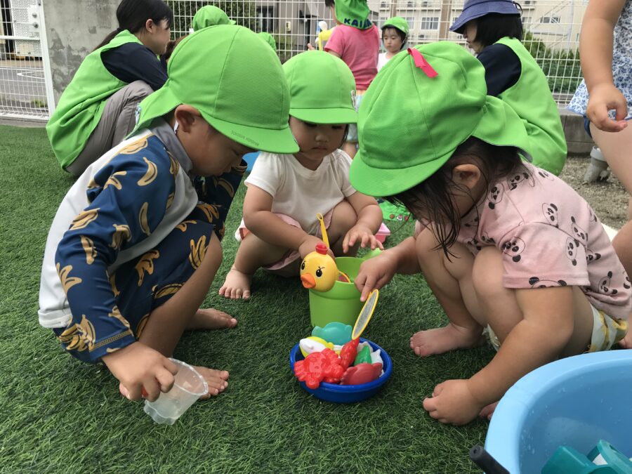 みんなでお魚を集めて「いっぱい魚がいるね!」と楽しくお話ししています🐟  お水も冷たくて気持ちよかったね😊