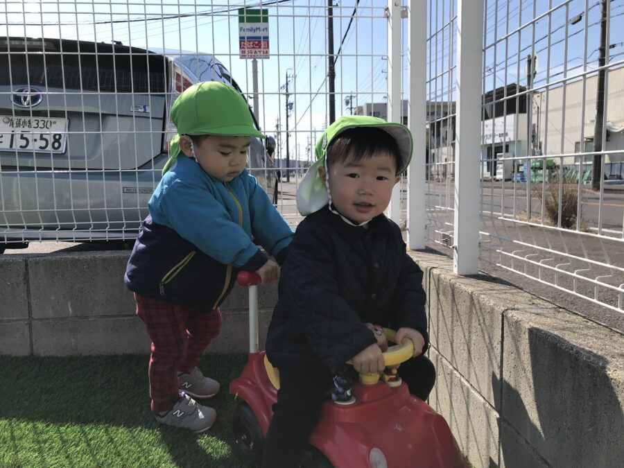 今日はとても暖かい日で春の訪れを感じますね😊 園庭に出て元気に遊びました☀️ こちらは仲良くドライブ中🚗 会話を楽しみながら 運転をしていました😌 追いかけっこも楽しかったね💕 砂場ではお花のケーキを作っていました😆 カテゴリ: 勝川園 タグ: