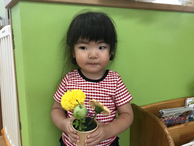 ガーベラ、マリーゴールド、青りんご、かすみ草、雪柳
