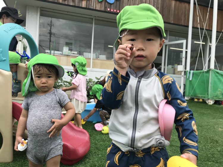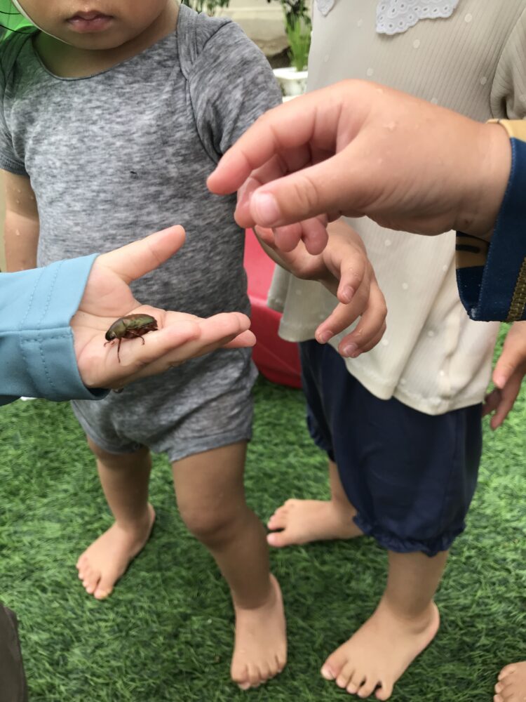 水あそびをしているとコガネムシさんが遊びにきてくれました。